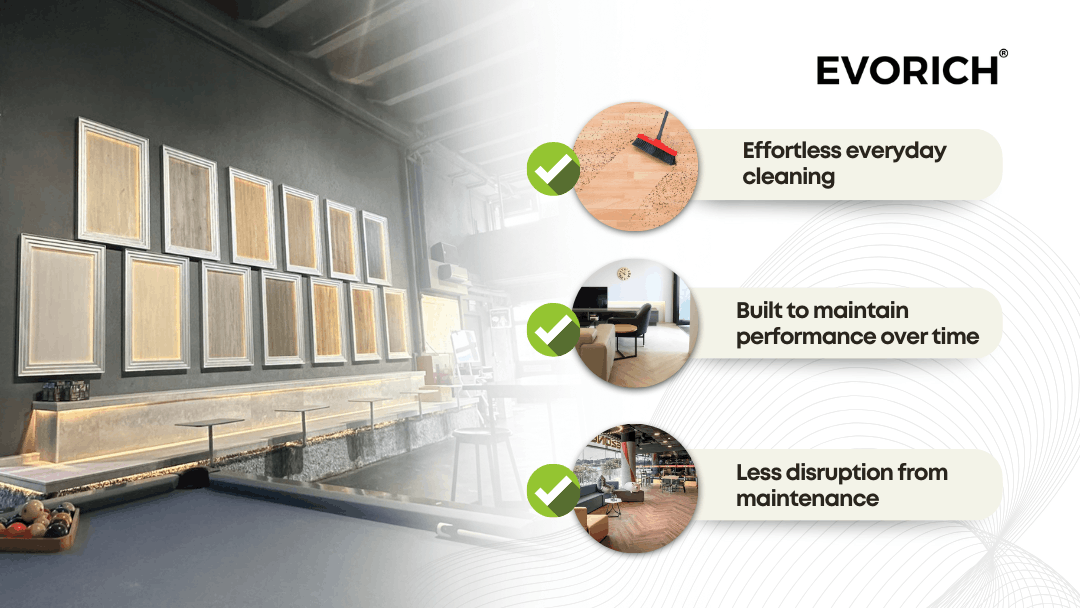 Commercial environments require flooring that is easy to maintain without disrupting operations. EVORICH commercial flooring offers: