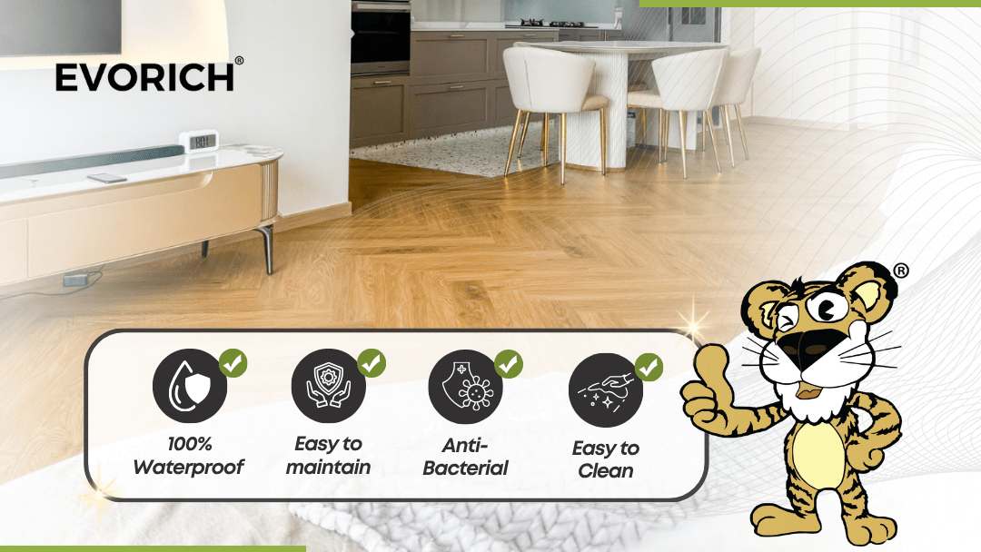 EVORICH’s Evo HERF (High-End Resilient Flooring) range revolutionises Vinyl Flooring in Singapore by using low-formaldehyde and low-VOC, materials. Every plank is designed to ensure cleaner indoor air, making it ideal for health-conscious homeowners and pet-friendly households.