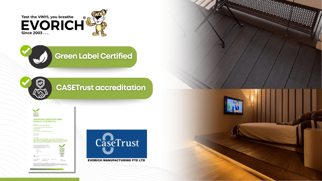 EVORICH flooring and decking products are tested and certified by international safety standards, ensuring each material contributes to a healthier indoor and outdoor environment. From CASETrust accreditation for transparent business practices to Green Label certification, EVORICH continues to uphold its mission of providing safe, sustainable, and health-conscious flooring solutions in Singapore.