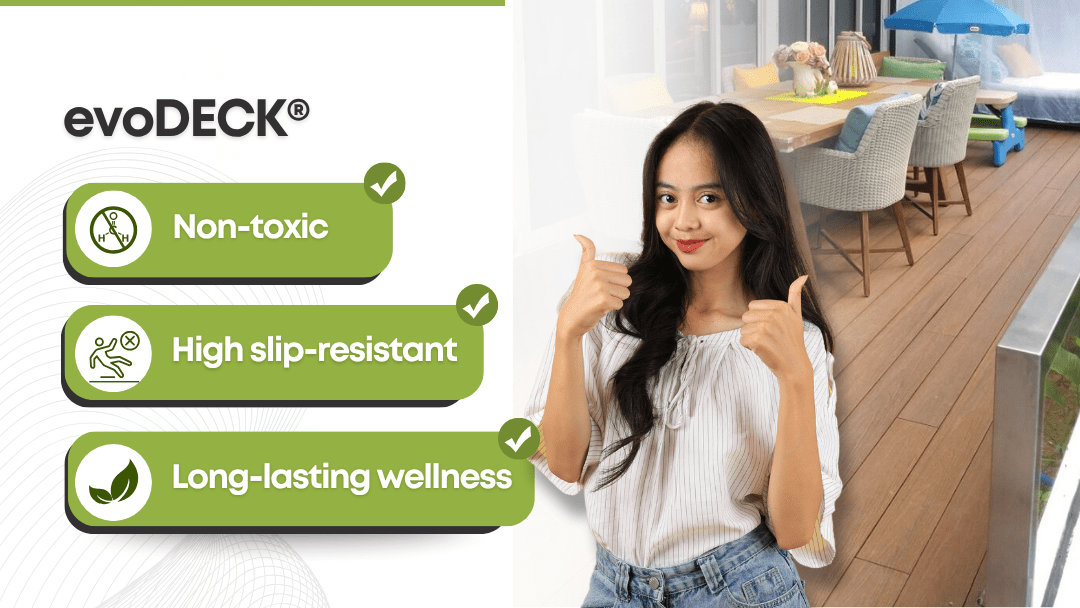 Made from eco-composite materials that resist splinters, termites, and reduced heat absorption, EVORICH’s evoDECK allows families to enjoy barefoot comfort and fresh air without worrying about harmful coatings or fading. Whether it’s a balcony, patio, or pool deck, these outdoor solutions are non-toxic, highly slip-resistant, and designed for long-lasting wellness.