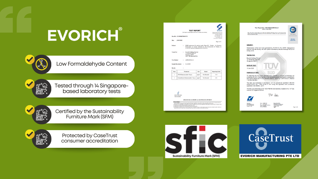 This makes EVORICH the only vinyl flooring brand in Singapore to be CaseTrust-accredited while meeting stringent local safety benchmarks.