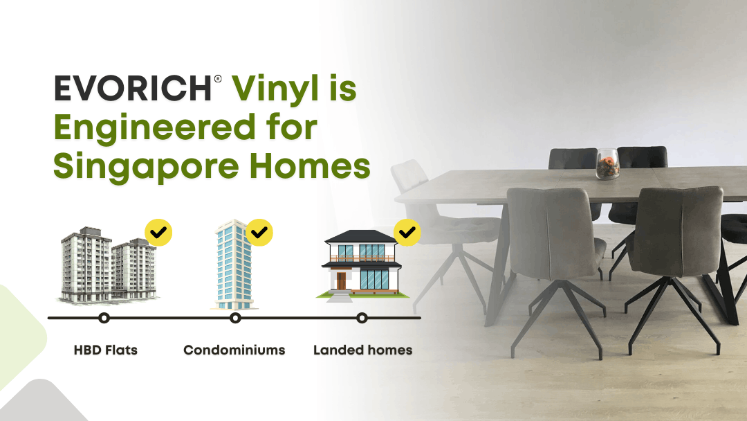Singapore’s climate and urban living conditions make vinyl flooring one of the most searched flooring solutions locally. EVORICH vinyl flooring is especially suited for Singapore because it is: